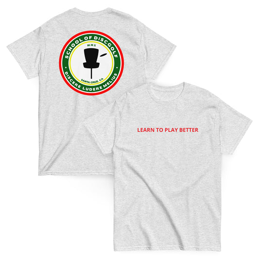 Unisex classic tee - Learn to Play Better Logo and School of Disc Golf Circle Logo with large latin motto in red, green, yellow, black & white