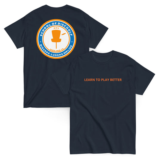 Unisex classic tee - Learn to Play Better Logo and School of Disc Golf Circle Logo with large latin motto in orange & blue