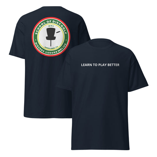Unisex classic tee - Learn to Play Better Logo and School of Disc Golf Circle Logo with large latin motto in red, blue & white