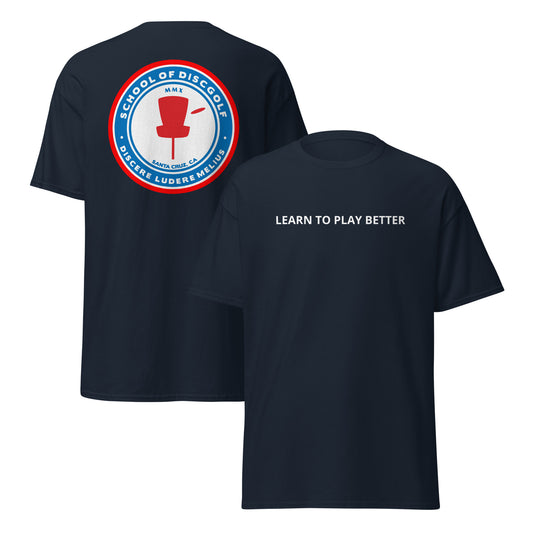 Unisex classic tee - Learn to Play Better Logo and School of Disc Golf Circle Logo with large latin motto in red, blue & white