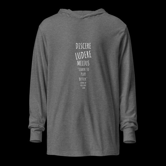 Hooded long-sleeve tee with School of Disc Golf logo on the back and Latin motto on the front
